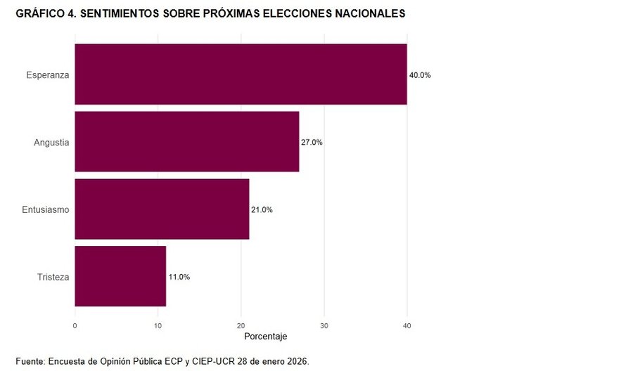 San José, 28 ene (elmundo.cr) – Un 61% de los costarricenses se sienten esperanzados o entusiasmados, según el último estudio del Centro de Investigación y Estudios Políticos (CIEP) de la Universidad de Costa Rica (UCR).