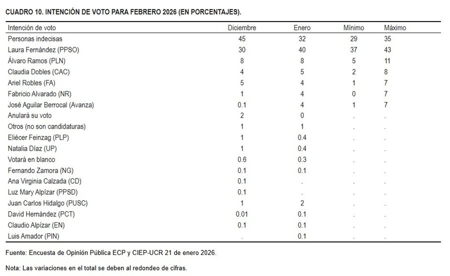 San José, 23 ene (elmundo.cr) – Un 77% de indecisos que se decidieron por un candidato se inclinaron por Laura Fernández, candidata de Pueblo Soberano, según el último estudio del Centro de Investigación y Estudios Políticos (CIEP) de la Universidad de Costa Rica (UCR).