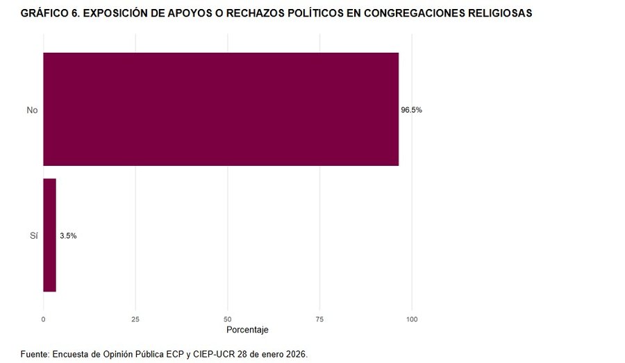 Según el estudio del Centro de Investigación y Estudios Políticos (CIEP) de la Universidad de Costa Rica (UCR), ante la consulta: Durante esta campaña electoral, ¿en su congregación religiosa (iglesia u otro espacio de culto) alguna autoridad religiosa ha expresado públicamente apoyo o rechazo a candidaturas o partidos políticos, indicando o sugiriendo por quién votar?, un 96.5% dijeron que no y solamente 3.5% que sí.