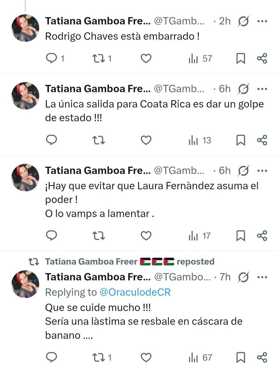 San José, 07 feb (elmundo.cr) – Una serie de mensajes publicados en la red social X (antes Twitter) por la usuaria Tatiana Gamboa Freer ha generado preocupación en el ámbito político y entre usuarios de redes sociales en Costa Rica, al contener expresiones que van desde descalificaciones personales contra el presidente Rodrigo Chaves hasta llamados explícitos a un golpe de Estado.