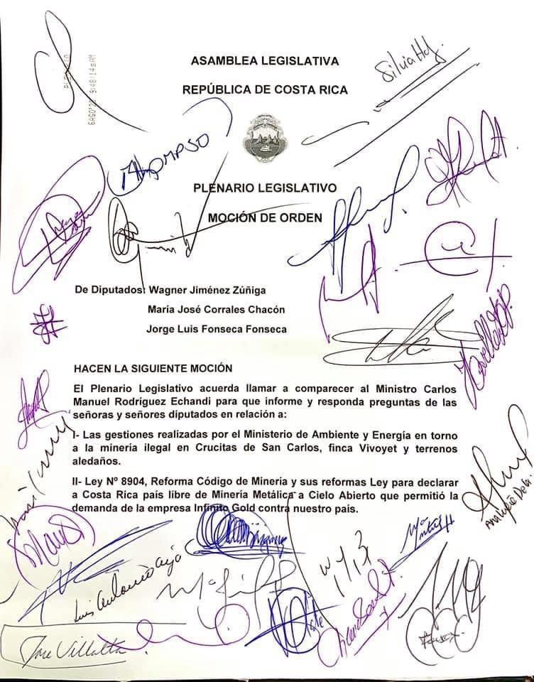 En la moción se indica que el jerarca debe referirse a las acciones realizadas por el Minae en torno a la minería ilegal en Crucitas de San Carlos, finca Vivoyet y terrenos aledaños