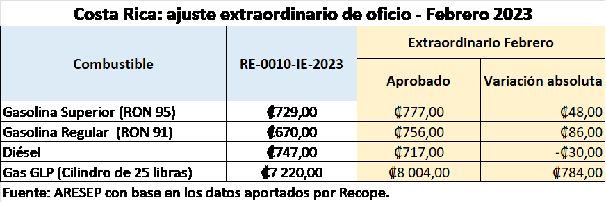 San José, 3 mar (elmundo.cr) – La Autoridad Reguladora de los Servicios Públicos (Aresep) aprobó la solicitud de ajuste extraordinario de precios presentada por Recope, correspondiente al mes de febrero.
