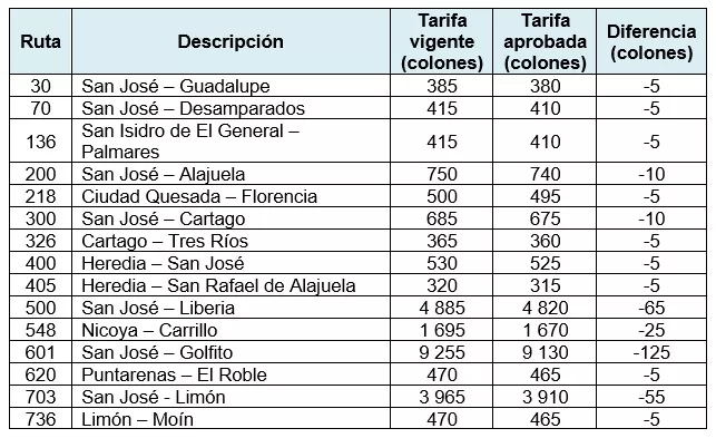 La disminución en la tarifa se aplica a 375 rutas de autobús, las cuales son operadas por 274 empresas. Las rebajas oscilan entre ₡5 y ₡135.