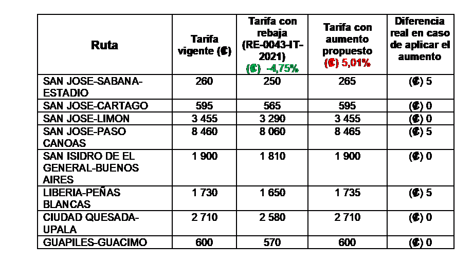 El ajuste propuesto, una vez aplicada la rebaja de la fijación anterior, podría tener un impacto en tarifas entre ₡0 y ₡425, sin embargo, en muchas de las rutas la tarifa vigente no variaría, como se muestra en los siguientes ejemplos: