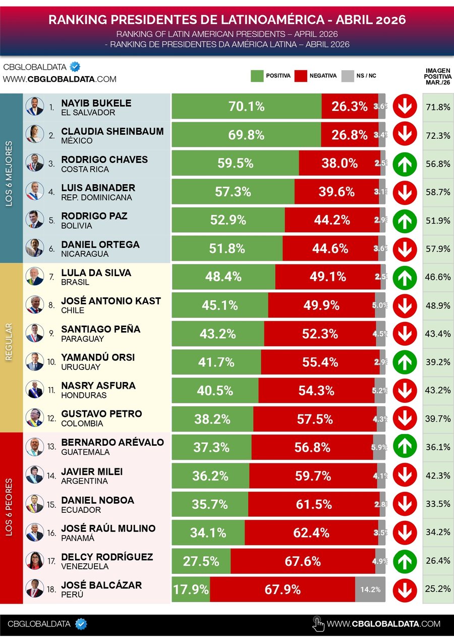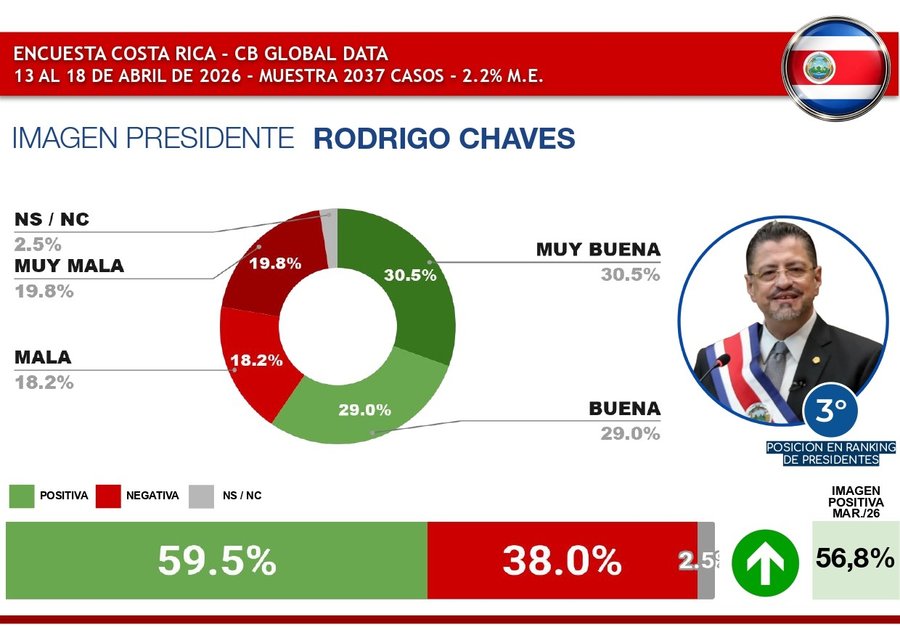 San José, 20 abr (elmundo.cr) – El presidente de la República, Rodrigo Chaves, se ubica al final de su mandato entre los tres mejores presidentes de Latinoamérica, según el Ranking presidentes de Latinoamérica – abril 2026 de la consultora CB Global Data.