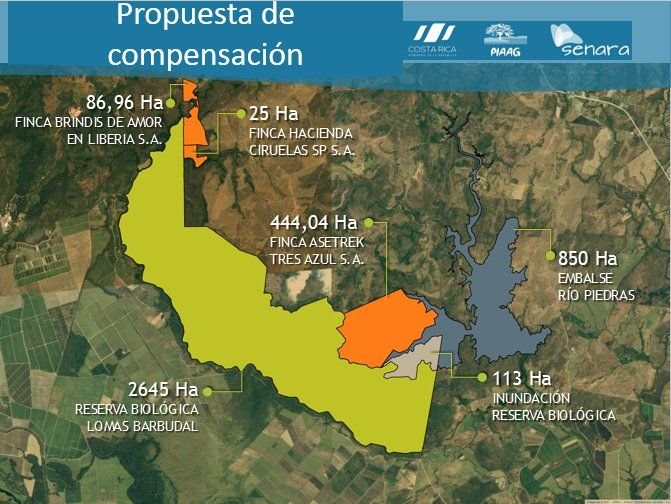 La modificación de los límites de la Reserva Biológica Lomas de Barbudal incluye la inundación de 113 hectáreas, que será compensada con la ampliación de la Reserva en 443 hectáreas. Dicho proceso dará cabida a la construcción del embalse sobre el río Piedras, con un espejo de agua de 850 hectáreas; infraestructura requerida en la presa para generar energía hidroeléctrica.