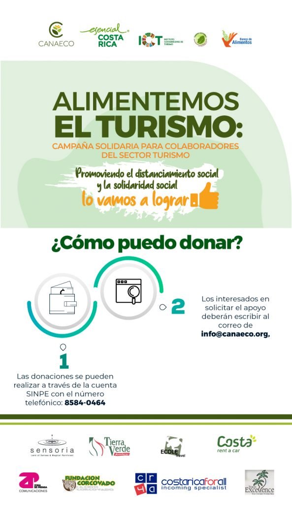 Con esto en mente “Canaeco realiza una campaña de recolección de dinero denominada Alimentemos el Turismo, el cual será usado para adquirir alimentos y productos de primera necesidad que serán donados a las personas del sector que más afectadas se encuentran por la crisis generada por el COVID-19. La posibilidad de tener mayor alcance con esta campaña depende de las donaciones, por eso instamos a quienes pueden solidarizarse a que lo hagan”, comentó Dayana Hernández, directora ejecutiva de Canaeco.