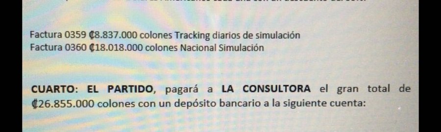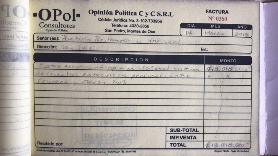 El partido presidido por Avendaño realizó un pago de 8.8 millones de colones a Opinión Política bajo factura número 359, mientras no canceló un monto de 18 millones de colones sobre factura número 360, ambas ligadas a un mismo contrato.