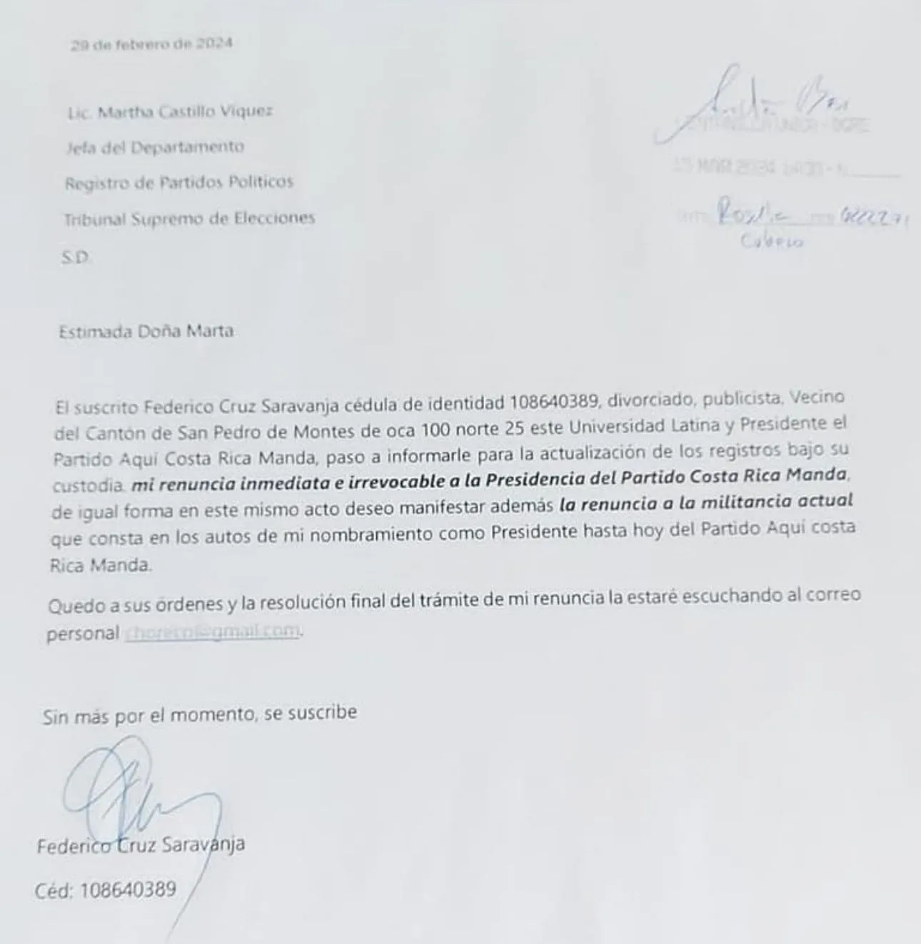 San José, 16 mar (elmundo.cr) – Federico Cruz “Choreco” presentó ante el Registro de Partidos Políticos del Tribunal Supremo de Elecciones (TSE), su renuncia al Partido Aquí Costa Rica Manda.