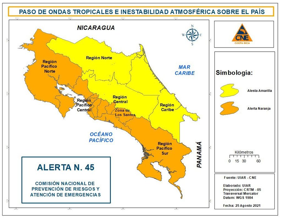 Estos escenarios, motivan a que la Comisión Nacional de Prevención de Riesgos y Atención de Emergencias (CNE) establezca la condición de Alerta Naranja para el Pacífico Norte, Central y Sur, y la parte Suroeste del Valle Central. Además, se establece la condición de Alerta Amarilla para el Valle Central, la Zona Norte y la Región Caribe.