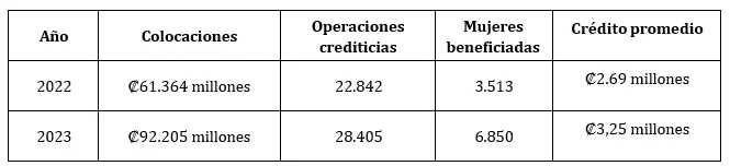 Durante el 2023, el total de las colocaciones en este grupo alcanzó los ₡92.205 millones, superando en 50,3% lo alcanzado un año antes cuando el monto había llegado hasta los ₡61.364 millones. El 76% de las colocaciones se dirigió a microempresarias.