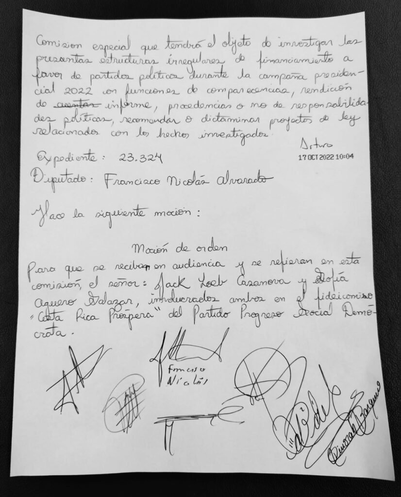 San José, 17 oct (elmundo.cr) – El diputado del Liberación Nacional, Francisco Nicolás, presentó una moción en la Comisión que Investiga el Financiamiento de Partidos Políticos, para llamar a audiencia a Jack Loeb Casanova y Sofía Agüero Salazar, involucrados en el Fideicomiso “Costa Rica Próspera” del Partido Progreso Social Democrático.