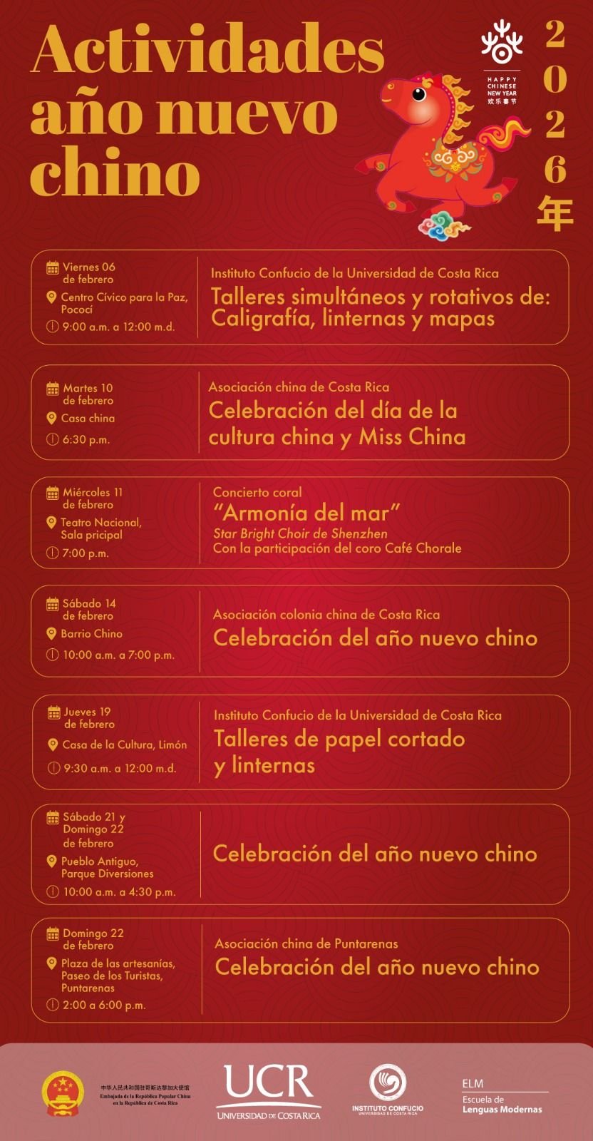 Durante febrero, distintas organizaciones culturales y académicas impulsarán eventos abiertos al público en varias regiones del país, con el objetivo de fortalecer el intercambio cultural entre China y Costa Rica y acercar esta festividad milenaria a toda la población.