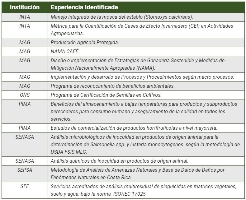 En el cuadro que se adjunta se muestran los temas en los que Costa Rica ha desarrollado experiencias exitosas y las entidades que lideran esas experiencias.