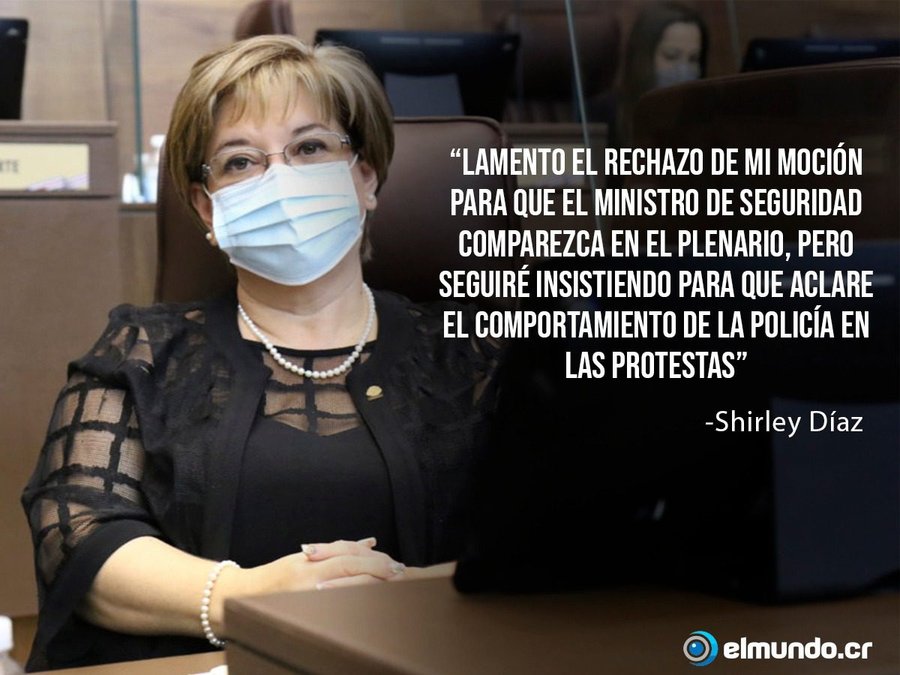 San José, 8 nov (elmundo.cr) – La diputada Shirley Díaz, del Partido Unidad Social Cristiana (PUSC), aseveró que “deploro el rechazo de mi moción para que el ministro de Seguridad, Michael Soto, compareciera en el Plenario”.