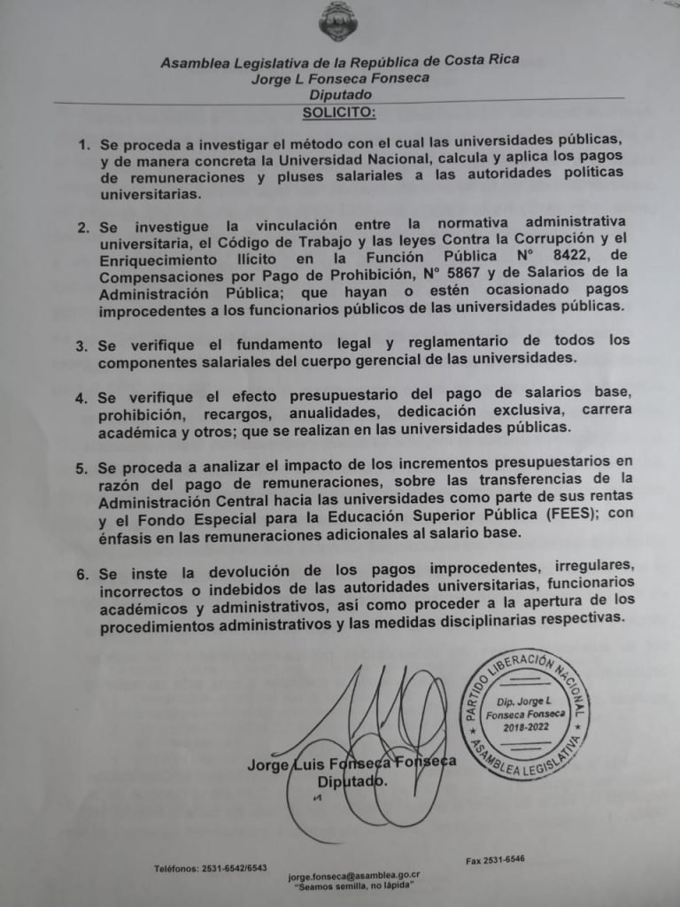 San José, 27 nov, (elmundo.cr)- El diputado Jorge Luis Fonseca, del Partido Liberación Nacional (PLN), presentó una denuncia en la Contraloría General de la República, contra el rector de la Universidad Nacional, Alberto Salom, por recibir pagos por más de 23 millones debido a un mal cálculo del incentivo de prohibición.
