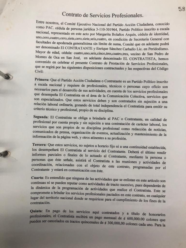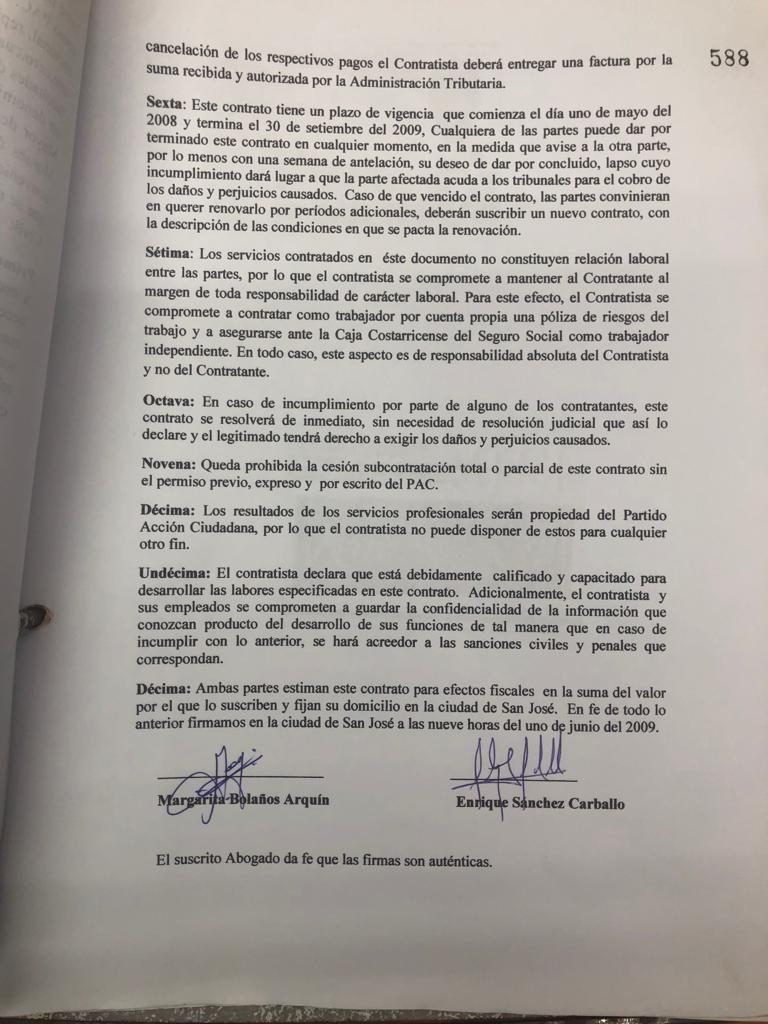 El contrato entre Margarita Bolaños Jarquín en representación del partido y Sánchez Carballo, fue firmado el primero de junio del 2010, y que se extendió por seis meses, pudiendo extenderse en plazos iguales. Por el primer contrato, Sánchez Carballo cobró un total de 3.6 millones de colones, que fueron descontados de la deuda política del PAC.