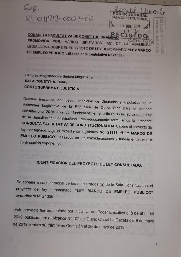 San José, 17 jun (elmundo.cr) – Diputados de varias fracciones presentaron una consulta de constitucionalidad al proyecto 21.336, Ley Marco de Empleo Público.
