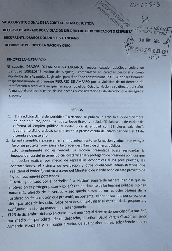 San José, 30 dic (elmundo.cr) – El diputado Dragos Dolanescu presentó un Recurso de Amparo contra La Nación por un artículo del medio donde se le acusaba de poner una moción “para defender pluses salariales del Poder Judicial, al sacarlo de la ley de empleo público”.