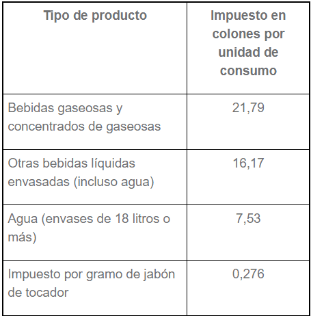 Según el decreto, el impuesto por unidad de consumo de bebidas gaseosas y concentrados de gaseosas pasó de ¢21,16 a ¢21,79, para otras bebidas líquidas envasadas (incluso agua) pasó de ¢15,70 a ¢16,17 y para agua en envases de 18 litros o más pasó de ¢0,268 a ¢0,0276.