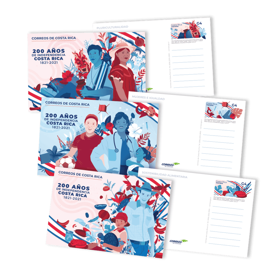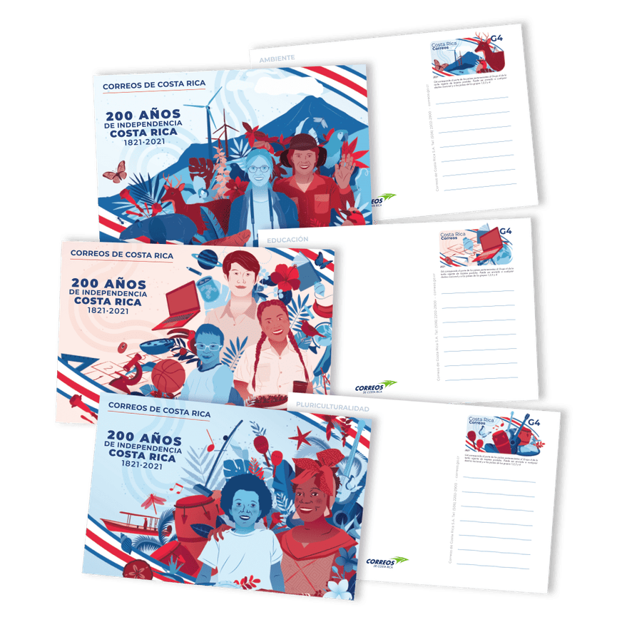 Además de las estampillas, para esta ocasión especial se elaboraron seis tarjetas postales pre porteadas, cuyo diseño fue inspirado en las ilustraciones que el Ministerio de Cultura y Juventud cuidadosamente ha producido para la celebración del Bicentenario.