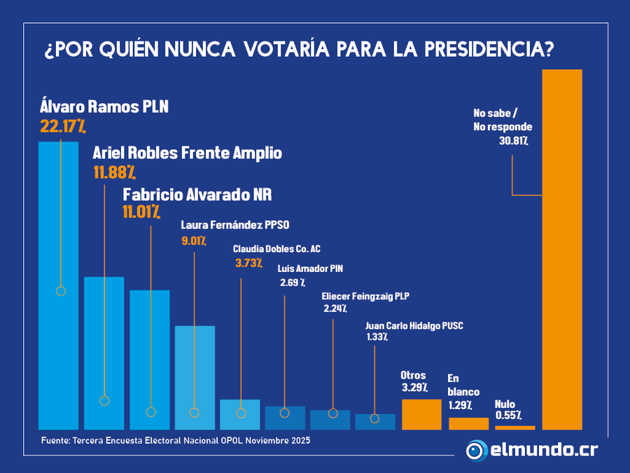 San José, 26 nov (elmundo.cr) – El candidato de Liberación Nacional, Álvaro Ramos, es la opción que más rechazo genera entre los costarricenses, según la última encuesta de OPol Consultores.