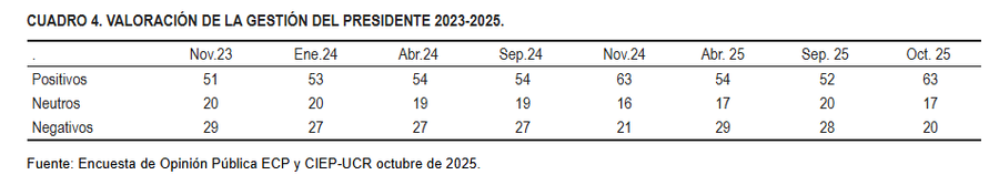 San José, 22 oct (elmundo.cr) – El apoyo al presidente de la República, Rodrigo Chaves, presentó un aumento significativo al alcanzar un 63% en octubre de 2025, según el último informe del Centro de Investigación y Estudios Políticos (CIEP) de la Universidad de Costa Rica (UCR).