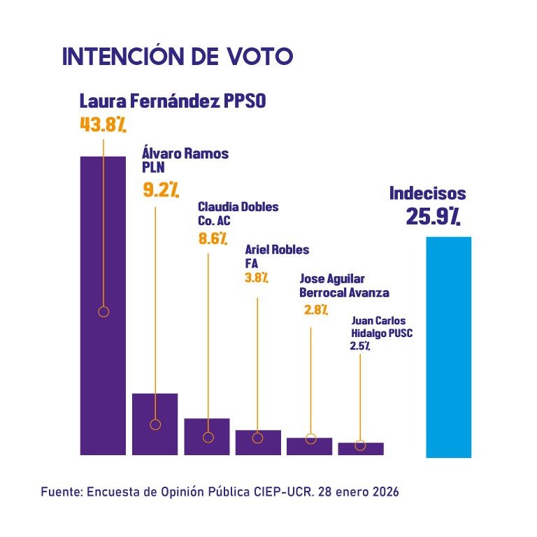 Fernández se ubica en el primer lugar con un 43,8%, le sigue el candidato de Liberación Nacional, Álvaro Ramos, con un 9,2%, en tercer lugar aparece Claudia Dobles de la Coalición Agenda Ciudadana con 8,6%, y sigue Ariel Robles del Frente Amplio con 3,8%, Jose Aguilar de Avanza con un 2,8% y Juan Carlos Hidalgo del PUSC con un 2,5%.