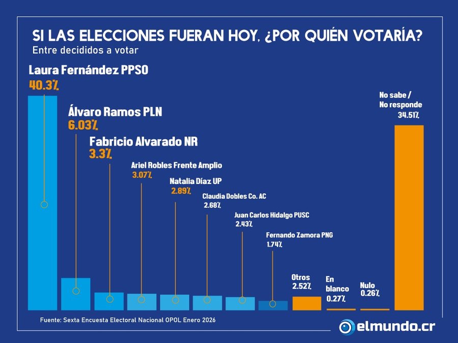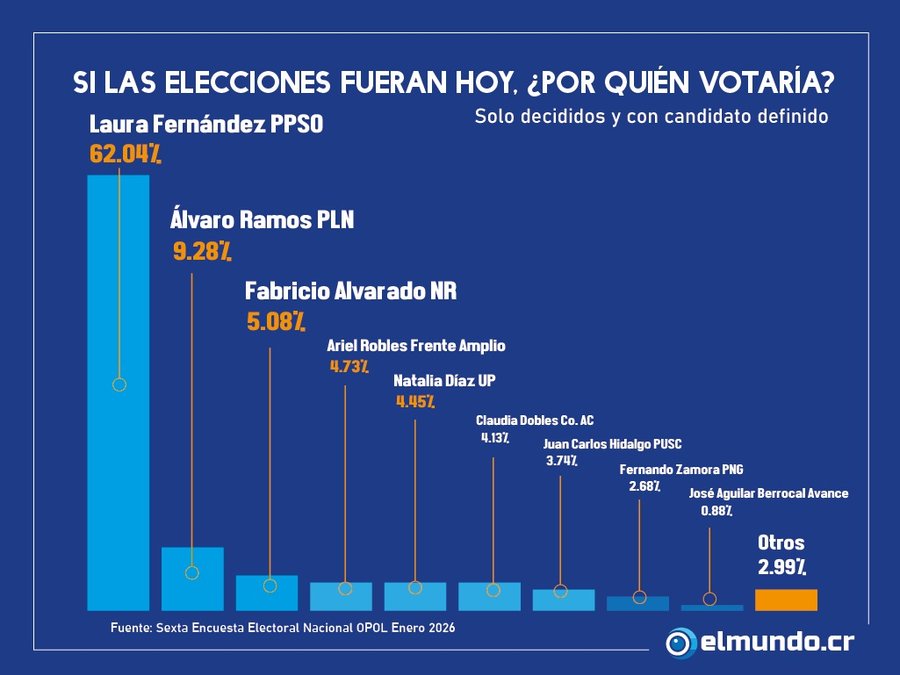 Según el estudio entre decididos a votar en las elecciones 2026, Laura Fernández obtendría un 40,3%, en segundo lugar aparece Álvaro Ramos del PLN con un 6,03% y de tercero Fabricio Alvarado de Nueva República con un 3,3%.