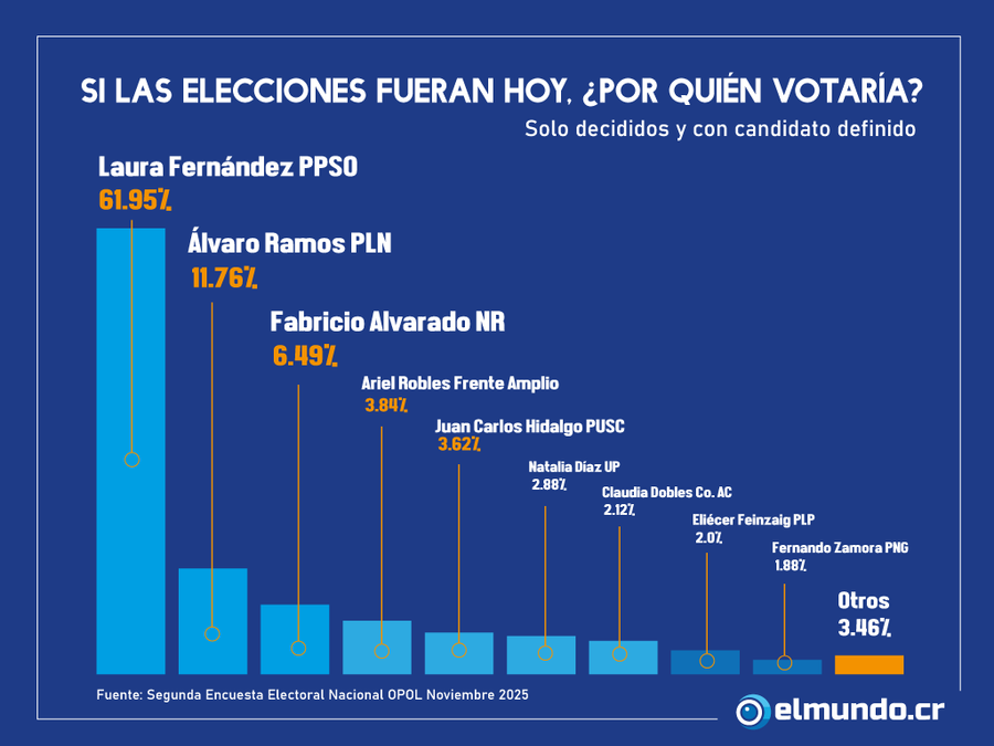 Mientras que entre decididos a votar en las elecciones 2026, Laura Fernández obtendría un 37,85%, en segundo lugar aparece Álvaro Ramos del PLN con un 7,19% y de tercero Fabricio Alvarado de Nueva República con un 3,97%.