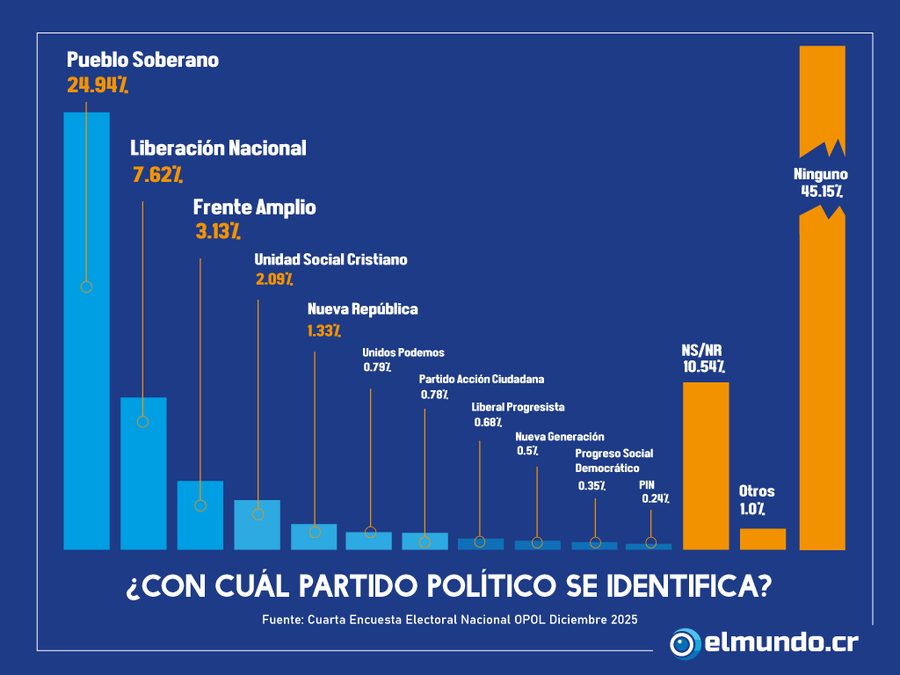 San José, 10 dic (elmundo.cr) – A solo mes y medio de las elecciones nacionales, el Partido Pueblo Soberano se consolida como el partido con más apoyo entre los costarricenses, mientras que el Partido Liberación Nacional llega a su histórico más bajo.