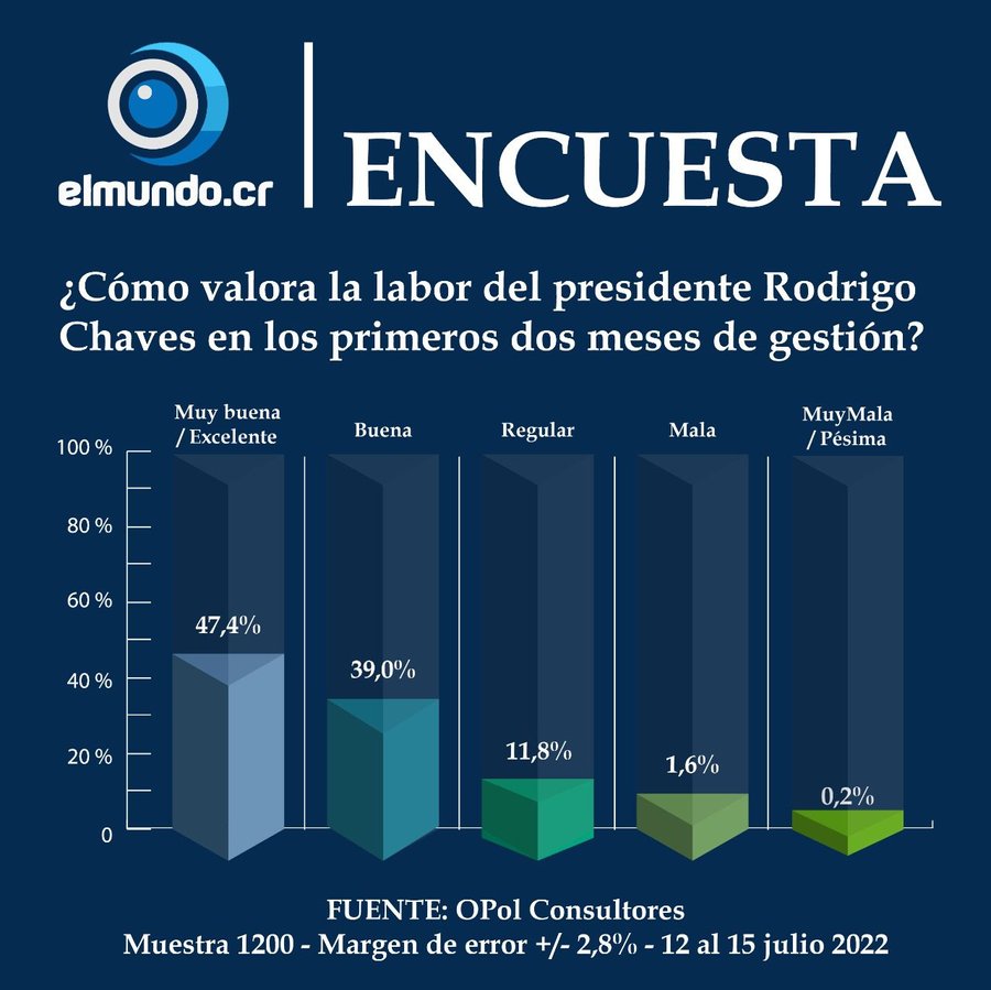 En el estudio se consultó: ¿Como valora la labor del presidente Rodrigo Chaves en los primeros dos meses de gestión? Ante esto los entrevistados indicaron que muy bueno/excelente un 47,4 %, bueno 39,0%, regular 11,8%, malo 1,6%, muy malo/pésimo 0,2%.