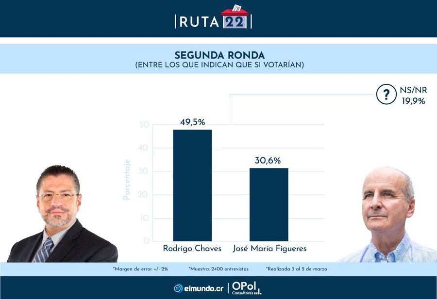 Según el estudio Chaves Robles recibe el respaldo del 49,5% de los entrevistados, mientras Figueres Olsen obtiene el apoyo del 30,6% para la segunda ronda.