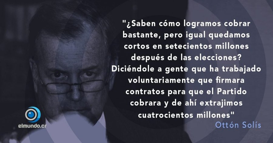 “Conocí partidarios que decían ‘yo voy a hacer un contrato con el partido y después voy a ver si le regalo la plata al partido’. Yo oí partidarios decir eso y yo, por lo menos, no me enfrenté a eso, no dije que eso era incorrecto, que era ilegal (…). No lo veté, no lo veté, o sea, si eso es el auto (la acusación), yo soy parte de los culpables“, aseguró ante los jueces Solís Fallas.