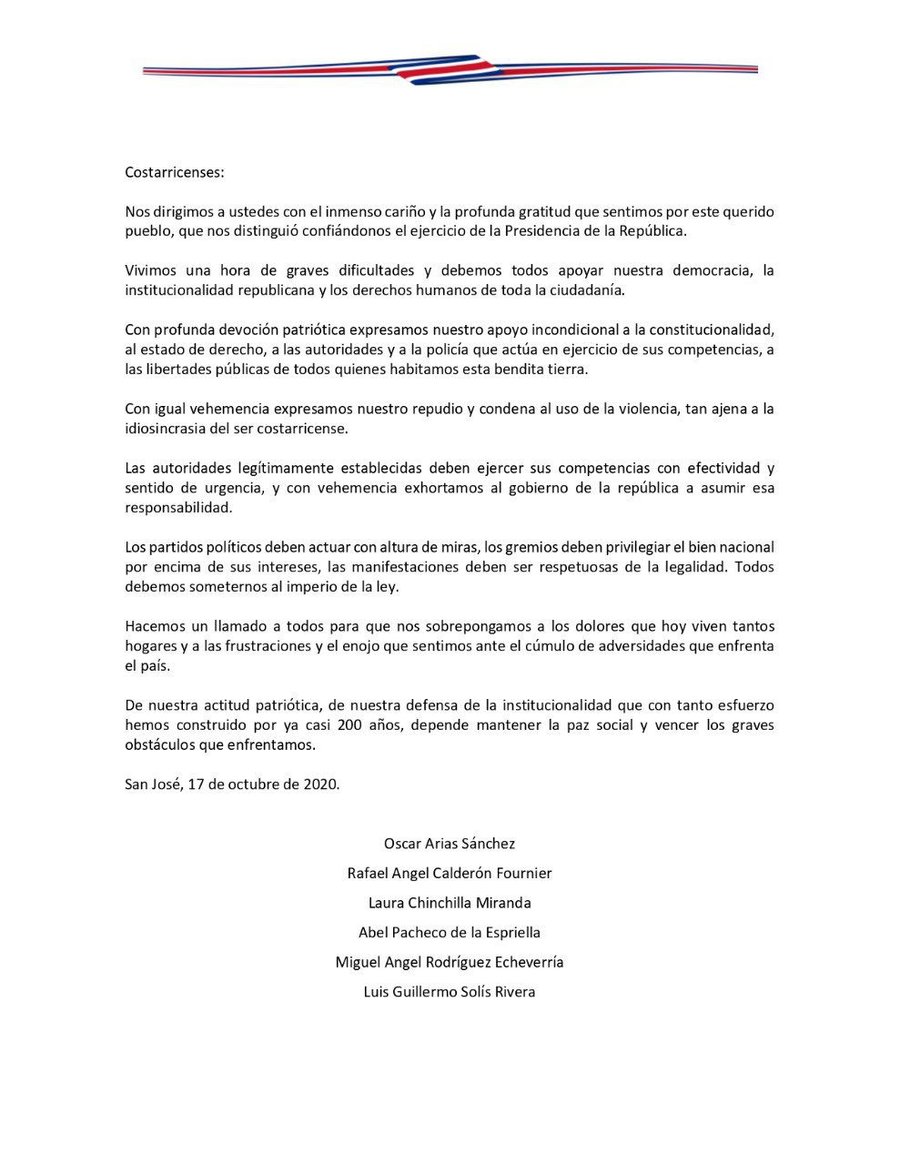 San José, 17 oct (elmundo.cr) – La tarde de este sábado los expresidentes Oscar Arias, Laura Chinchilla, Rafael Ángel Calderón, Abel Pacheco, Luis Guillermo Solís y Miguel Ángel Rodríguez; hicieron un llamado al diálogo ante la situación que se vive en el país.