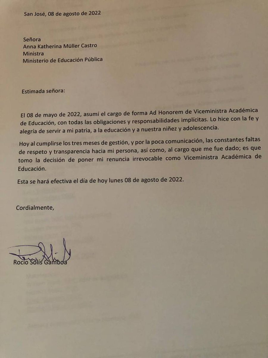 San José, 13 ago (elmundo.cr) – Mediante una carta de tres párrafos la viceministra Académica del Ministerio de Educación Pública (MEP), Rocío Solís Gamboa, reveló las causas de la renuncia a su cargo.