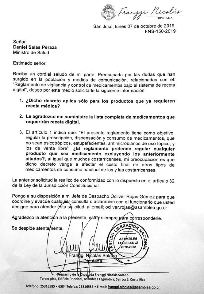 San José, 8 oct (elmundo.cr)- La diputada del PLN, Franggi Nicolás, manifestó su preocupación por un supuesto decreto que obligaría a los costarricenses a comprar ciertos medicamentos solo con receta digital.