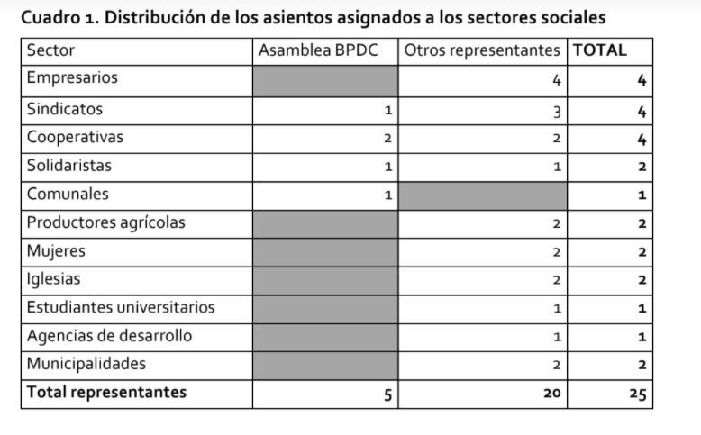 Los sectores de la sociedad civil tendrán asignados 25 representantes, que implican la mayoría de las personas integrantes de la mesa de diálogo. Corresponderá a los distintos sectores acreditar sus representantes de conformidad con los mecanismos establecidos.