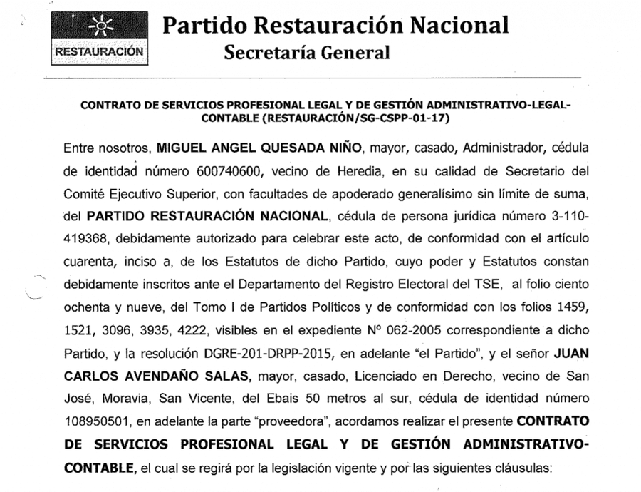 Avendaño Salas firmó un contrato de servicios profesionales por 32 millones de colones con Restauración Nacional bajo el concepto de “Servicio profesional legal y de gestión administrativo-contable”.