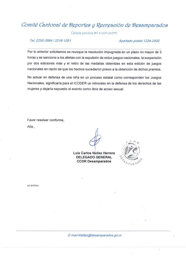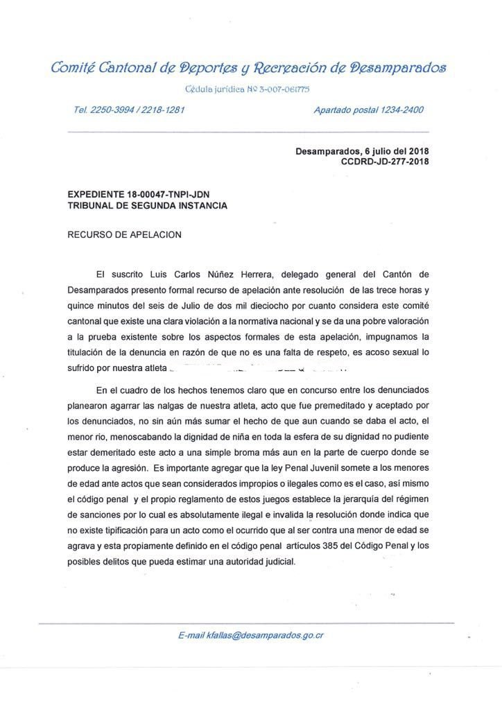 El delegado general del CCDR de Desamparados, agregó al recurso que la ley Penal Juvenil somete a los menores de edad ante actos que sean considerados impropios o ilegales como es el caso, así mismo el código penal y el reglamento de estos juegos establece la jerarquía del régimen de sanciones por lo cual es absolutamente ilegal e inválida la resolución donde indica que no existe tipificación para un acto como el ocurrido que al ser contra una menor de edad se agrava y está definido en artículos 385 del Código Penal.