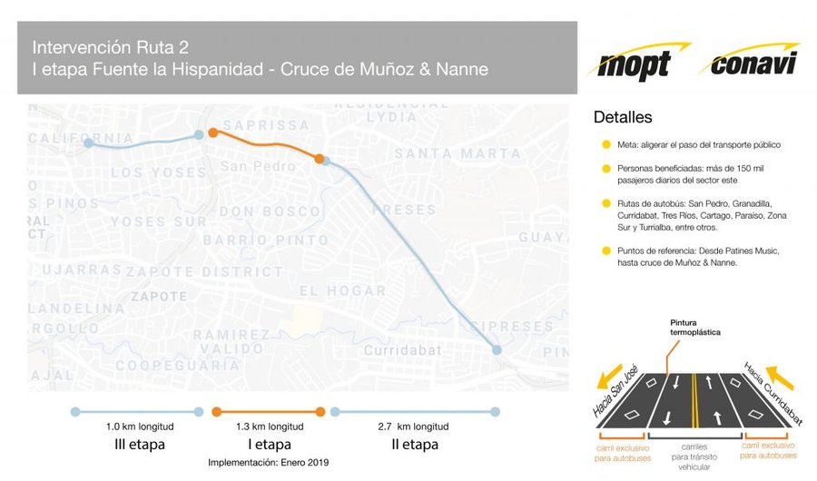 San José, 12 dic (elmundo.cr) – El Ministerio de Obras Públicas y Transportes y el Consejo Nacional de Vialidad (Conavi), implementarán en el mes de enero carriles exclusivos para autobuses en el sector de San Pedro, que irán, en una primera etapa, desde la rotonda de La Hispanidad hasta el supermercado Muñoz & Nanne, con una inversión de ¢ 14.2 millones.