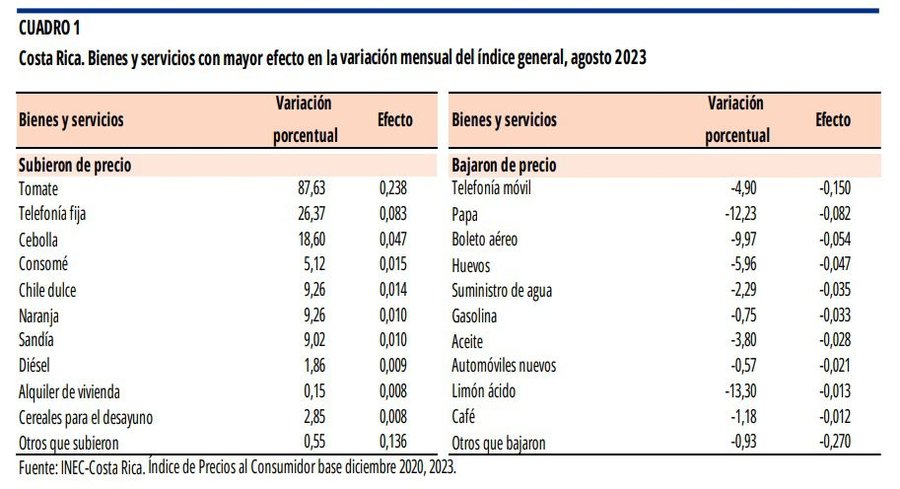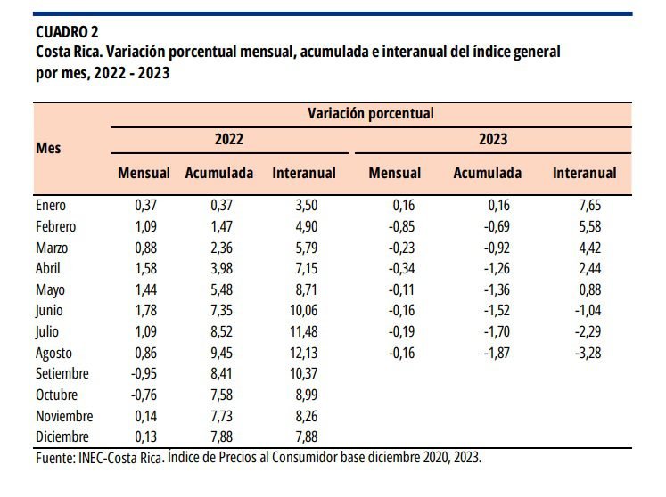 San José, 7 sep (elmundo.cr) – La variación mensual del Índice de Precios al Consumidor (IPC) en agosto fue -0,16%, con lo que se alcanzó una variación interanual de -3,28 %.