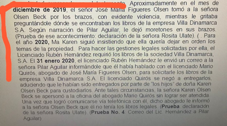 Según se desprende de la declaración del sobrino del candidato liberacionista y que constan en el expediente 21-0000381-175-PE: “Aproximadamente en el mes de diciembre de 2019, el señor José María Figueres tomó a la señora Olsen Beck por los brazos, con evidente violencia, mientras le gritaba preguntándole donde se encontraban los libros de la empresa Villa Dinamarca. Según narración de Pilar Aguilar, le dejó moretones en sus brazos (Prueba de ese acontecimiento: declaración de la señora Rosita Ulate)”.