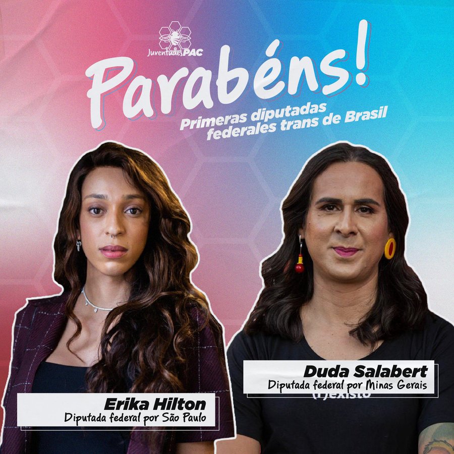 San José, 04 oct (elmundo.cr) – La Juventud del Partido Acción Ciudadana y la Juventud del Frente Amplio celebraron la “elección histórica” de Erika Hilton y Duda Salabert, como primeras diputadas federales trans de Brasil.
