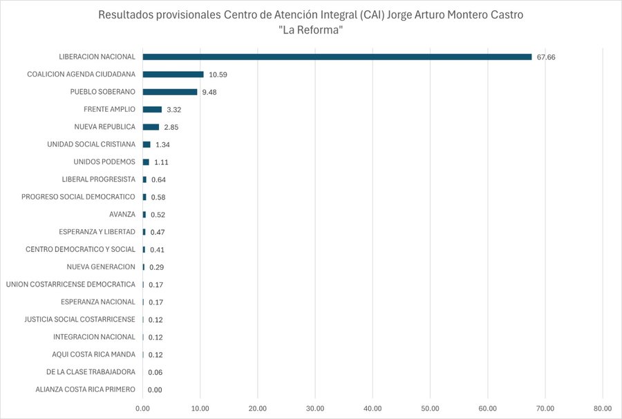 Alajuela, 04 feb (elmundo.cr) – El Partido Liberación Nacional (PLN) arrasó en las elecciones nacionales en el Centro de Atención Integral (CAI) Jorge Arturo Montero Castro “La Reforma”.