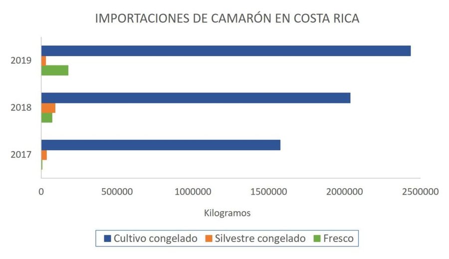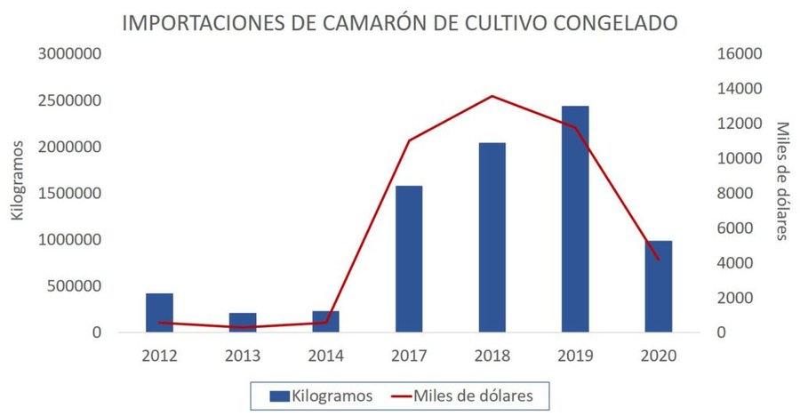 En 2017, las importaciones de camarón congelado de cultivo ascendieron a más de 1.500.000 kilos. Asimismo, en los años 2018 y 2019, superaron los 2.000.000 y 2.400.000 kilos, respectivamente. Por su parte, a septiembre de 2020, estas importaciones contabilizaban más de 900.000 kilos. Dichas importaciones provienen, principalmente, de Nicaragua, Honduras, Ecuador y Panamá.