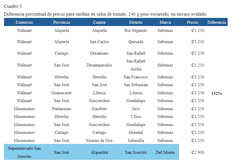 El MEIC encontró diferencias de hasta 155% en sardina en salsa de tomate de 82 g peso escurrido en envase rectangular marca Madrigal.