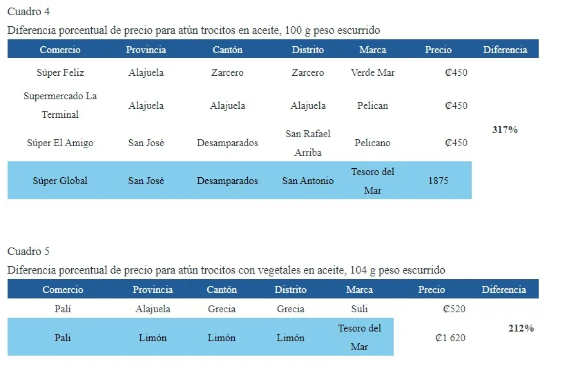 En cuanto a atunes, tanto para la presentación de aceite en trocitos y trocitos con vegetales en aceite; se obtuvo la información del aplicativo MiMejorCompraCR, de la cual se encontraron las siguientes diferencias.