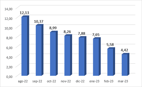 La variación interanual a partir de agosto 2022 presenta una tendencia claramente decreciente: