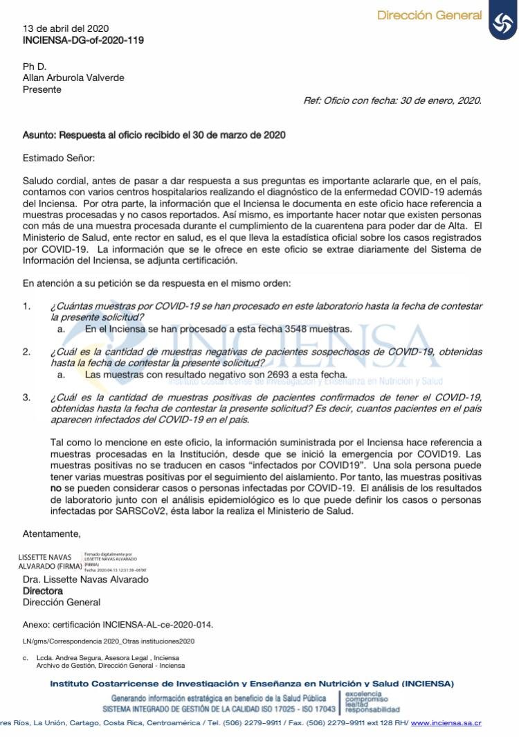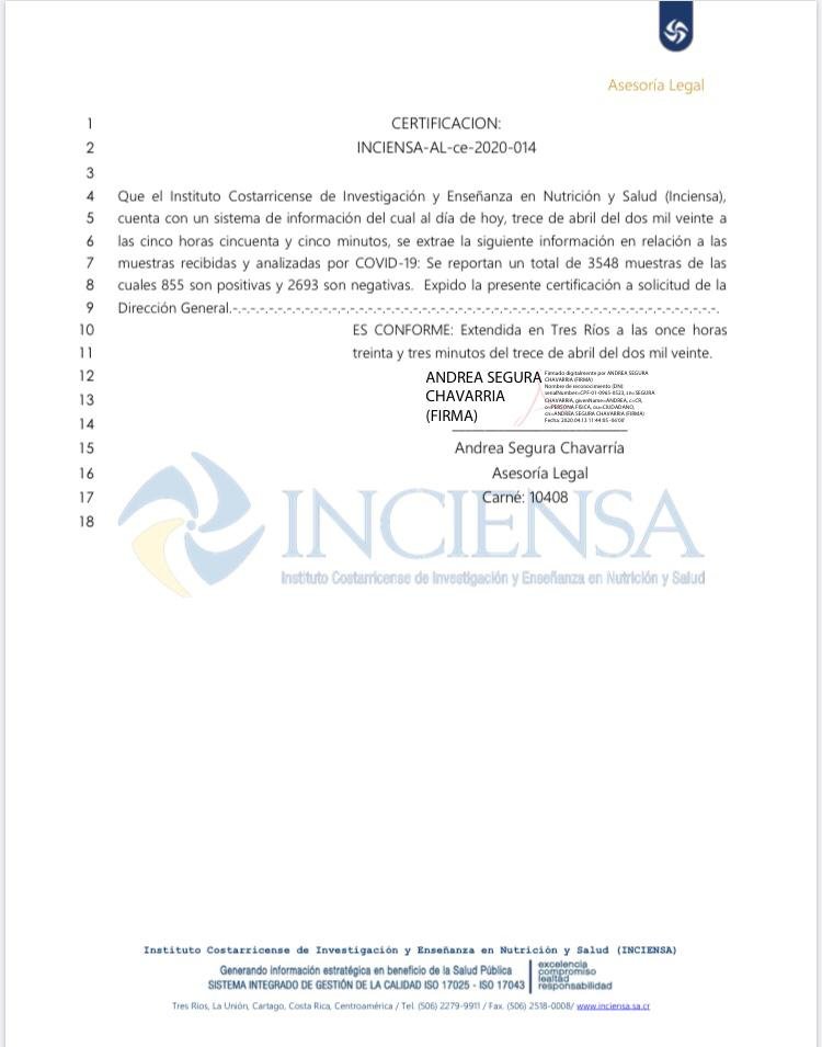 San José, 13 abr (elmundo.cr)- El Ministerio de Salud realizó una aclaración debido a un comunicado de Inciensa sobre la cantidad de pruebas positivas por COVID-19.